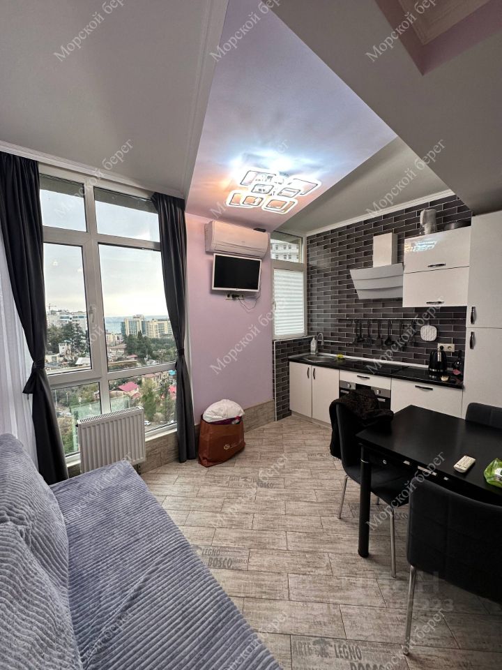 Функциональная планировка: кухня-гостиная, отдельная спальня, совмещённый санузел. Панорамные окна обеспечивают хорошее естественное освещение и открывают видовые характеристики, которые ценятся в центре Сочи.