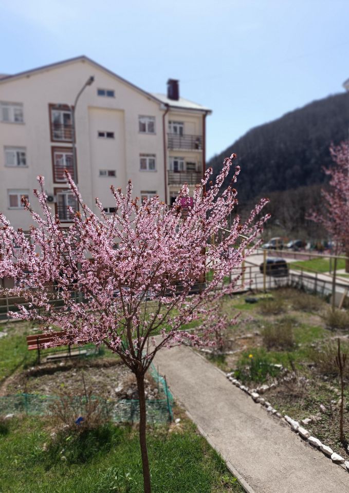 Фото улицы сделаны в разные времена года. Под окном комнаты цветет сакура(вишня) весной(на фото).