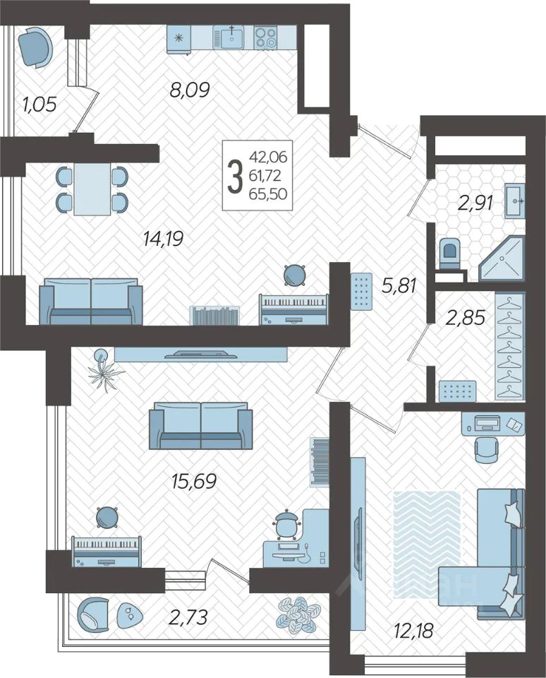 Застройщиком спроектированы одно-, двух- и трехкомнатные квартиры.