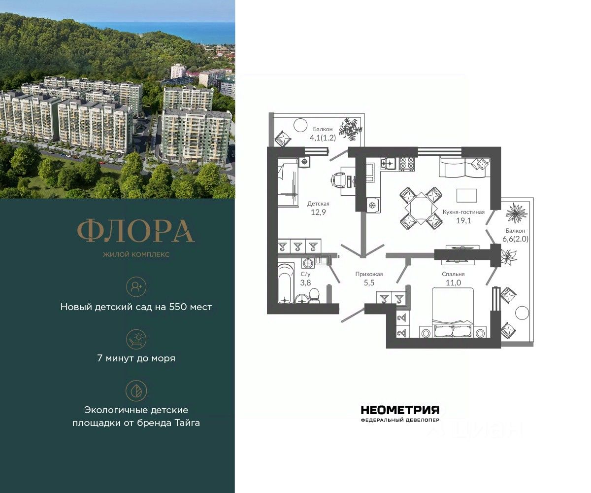 Продается квартира в ЖК "Флора" от федерального девелопера "Неометрия". Это жилой комплекс комфорт-класса в самом зеленом районе Сочи. При проектировании постарались максимально сохранить окружающую флору и фауну. Теплое море, горы, целебные источники, река, близость заповедника все это уже рядом с вами.