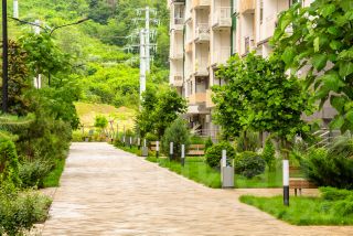 • Яркие аллеи с цветниками и кустарниками для прогулок и утренних пробежек