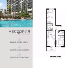 Продается квартира в жилом комплексе бизнес-класса "Лестория". В составе ЖК предусмотрена собственная аквазона площадью 473 квадратных метра с двумя подогреваемыми бассейнами, что соответствуют стандартам бизнес-класса.