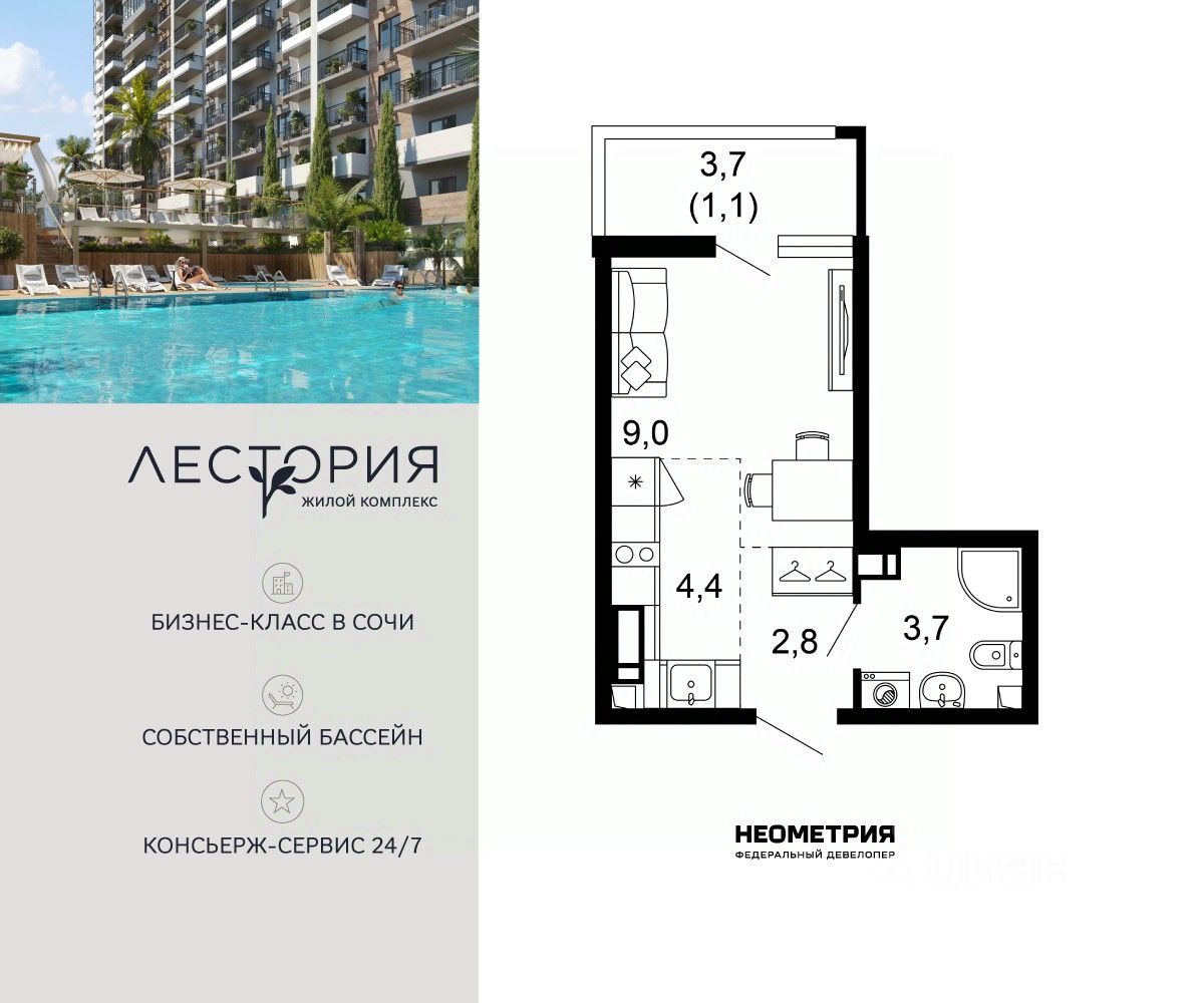 Продается квартира в жилом комплексе бизнес-класса "Лестория". В составе ЖК предусмотрена собственная аквазона площадью 473 квадратных метра с двумя подогреваемыми бассейнами, что соответствуют стандартам бизнес-класса.