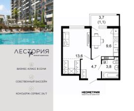 Продается квартира в жилом комплексе бизнес-класса "Лестория". В составе ЖК предусмотрена собственная аквазона площадью 473 квадратных метра с двумя подогреваемыми бассейнами, что соответствуют стандартам бизнес-класса.