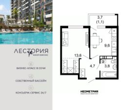 Продается квартира в жилом комплексе бизнес-класса "Лестория". В составе ЖК предусмотрена собственная аквазона площадью 473 квадратных метра с двумя подогреваемыми бассейнами, что соответствуют стандартам бизнес-класса.