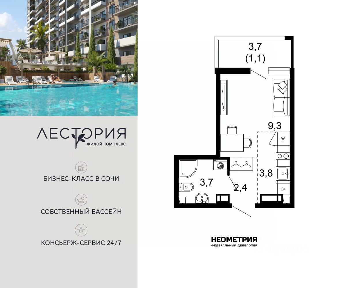 Продается квартира в жилом комплексе бизнес-класса "Лестория". В составе ЖК предусмотрена собственная аквазона площадью 473 квадратных метра с двумя подогреваемыми бассейнами, что соответствуют стандартам бизнес-класса.