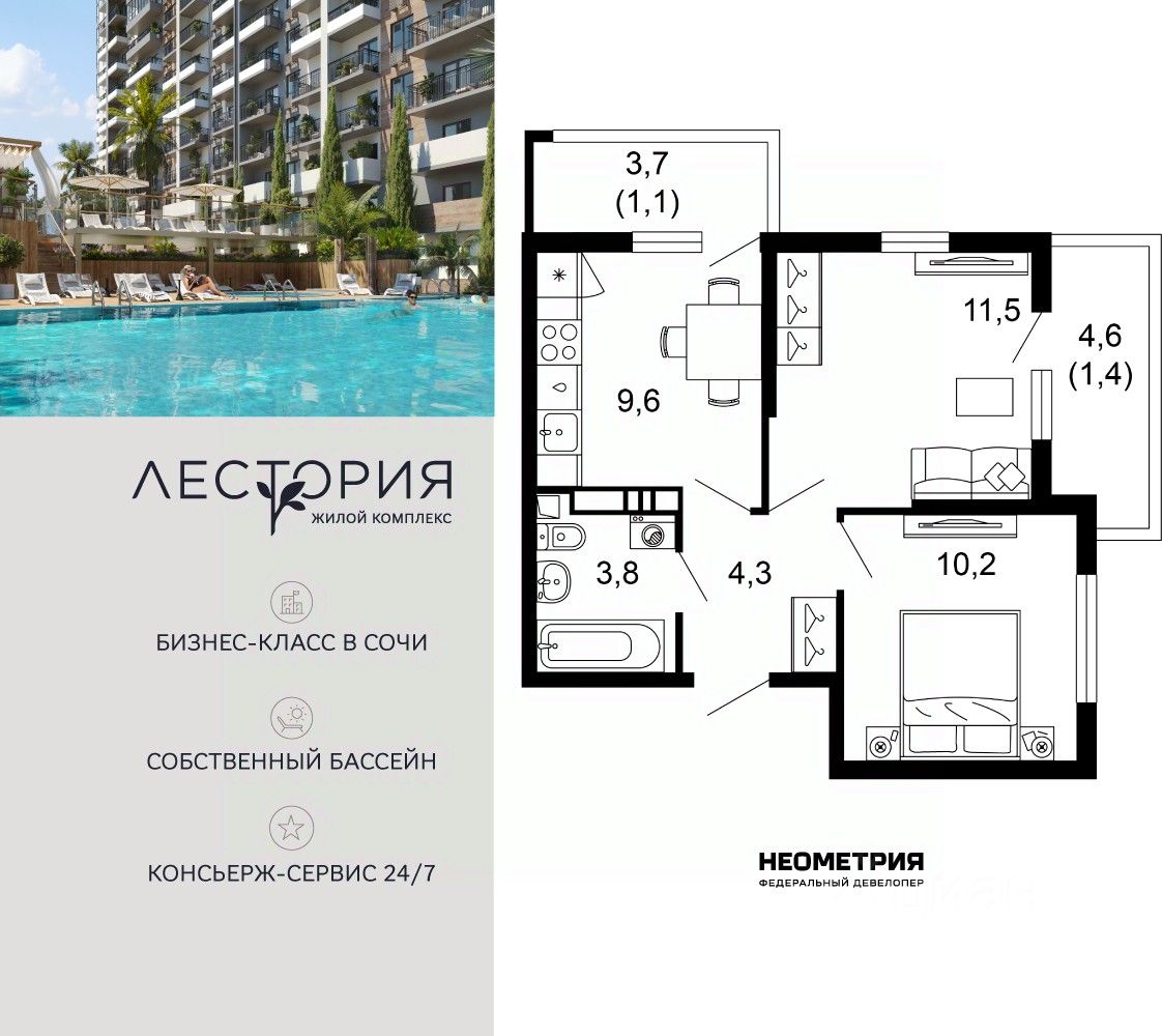 Продается квартира в жилом комплексе бизнес-класса "Лестория". В составе ЖК предусмотрена собственная аквазона площадью 473 квадратных метра с двумя подогреваемыми бассейнами, что соответствуют стандартам бизнес-класса.