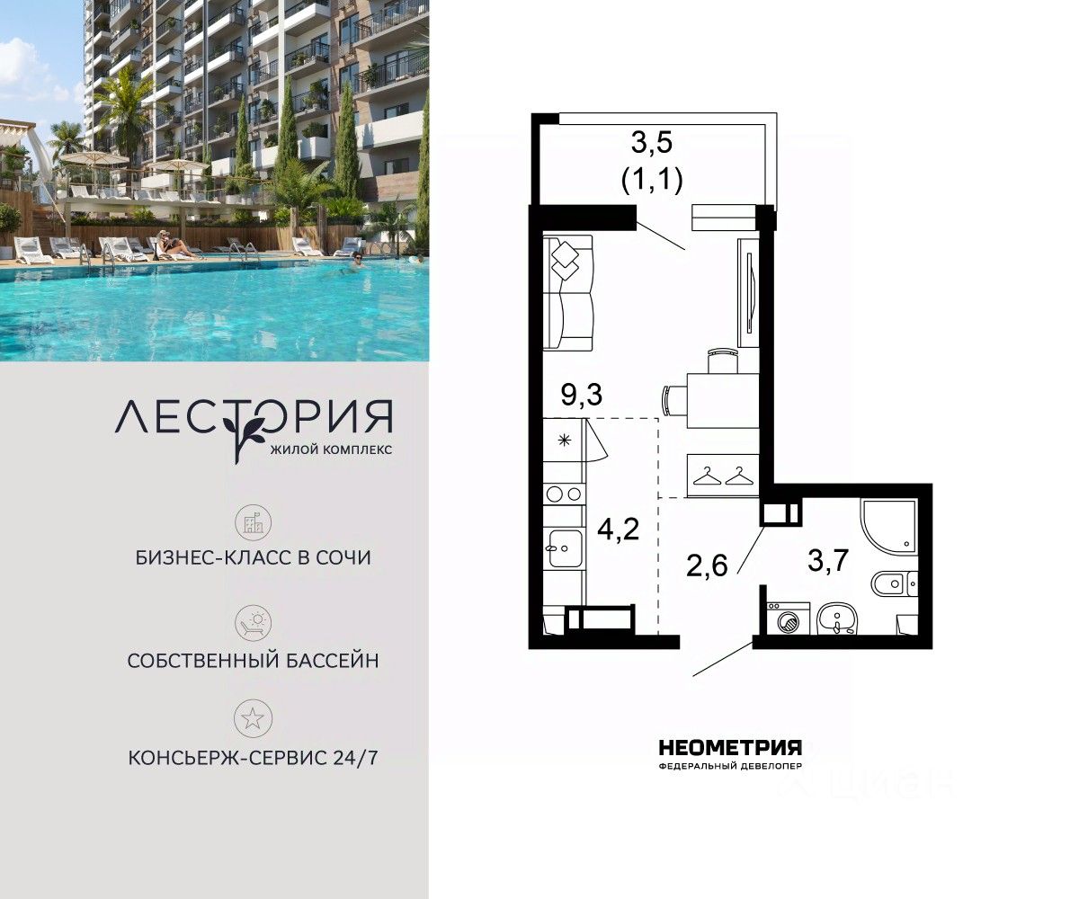 Продается квартира в жилом комплексе бизнес-класса "Лестория". В составе ЖК предусмотрена собственная аквазона площадью 473 квадратных метра с двумя подогреваемыми бассейнами, что соответствуют стандартам бизнес-класса.