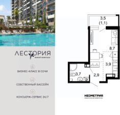 Продается квартира в жилом комплексе бизнес-класса "Лестория". В составе ЖК предусмотрена собственная аквазона площадью 473 квадратных метра с двумя подогреваемыми бассейнами, что соответствуют стандартам бизнес-класса.