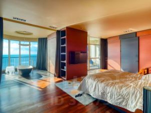 Квартира расположена на 25 этаже 27-этажного монолитного дома с высотой потолков 4 м, что создает ощущение простора и лёгкости.