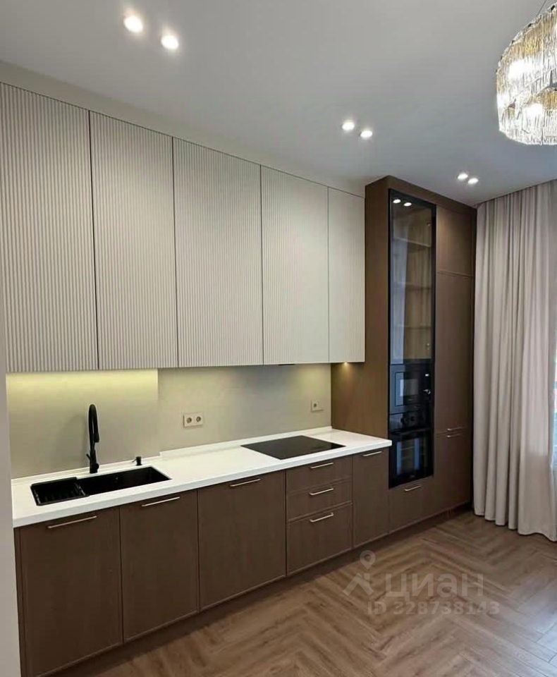 - Кухня оборудована современной техникой и имеет стильный гарнитур.