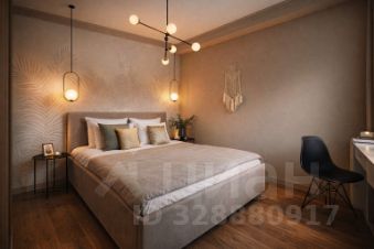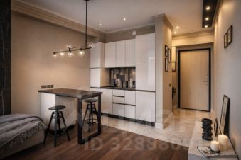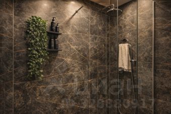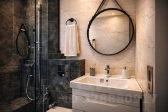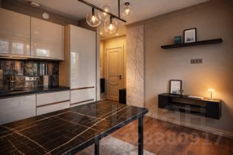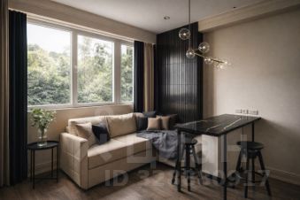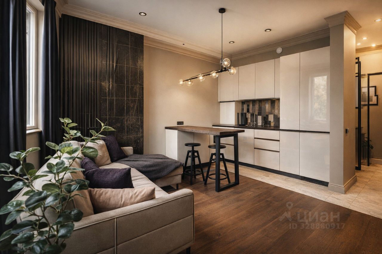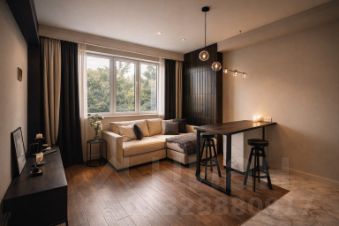 Ремонт дизайнерский, всё стильно и продуманно. Большая кухня-гостиная 15 м² — есть барная стойка, диван, вся обстановка. Спальная зона отделена. Санузел с тропическим душем и мраморной плиткой. Балкон, большие окна, вид на зелень.