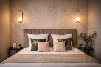 • Двуспальная кровать с мягким изголовьем в тканевой обивке