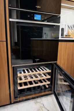 - Кухня из натурального шпона, столешница и фартук Кварц, измельчитель, очистка воды с osmos, раковина и смесители Omaikiri, Винный холодильник