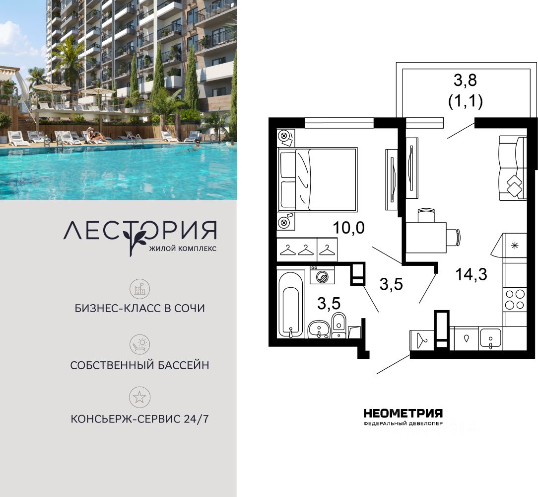 Продается квартира в жилом комплексе бизнес-класса "Лестория". В составе ЖК предусмотрена собственная аквазона площадью 473 квадратных метра с двумя подогреваемыми бассейнами, что соответствуют стандартам бизнес-класса.