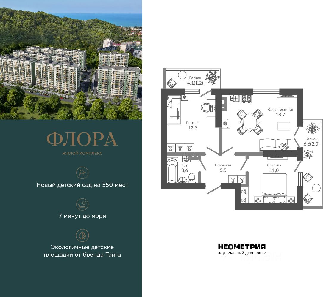 Продается квартира в ЖК "Флора" от федерального девелопера "Неометрия". Это жилой комплекс комфорт-класса в самом зеленом районе Сочи. При проектировании постарались максимально сохранить окружающую флору и фауну. Теплое море, горы, целебные источники, река, близость заповедника все это уже рядом с вами.