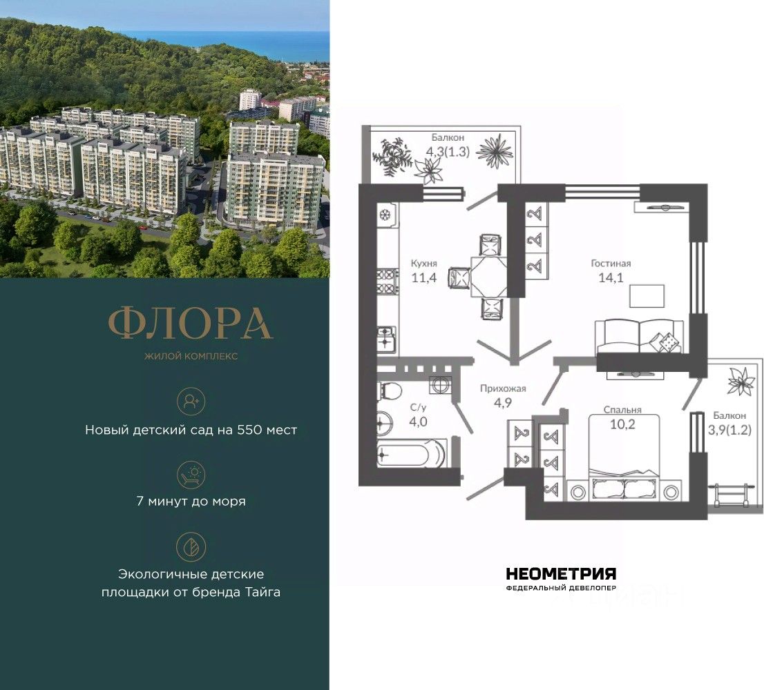 Продается квартира в ЖК "Флора" от федерального девелопера "Неометрия". Это жилой комплекс комфорт-класса в самом зеленом районе Сочи. При проектировании постарались максимально сохранить окружающую флору и фауну. Теплое море, горы, целебные источники, река, близость заповедника все это уже рядом с вами.