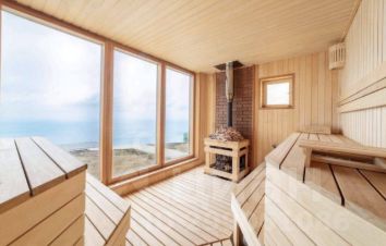 Отдельное здание с панорамной сауной включает комнату для отдыха и санузел.