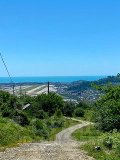 Ровный участок 8 соток, вид на море, аэропорт, реку Мзымту, Олимпийский парк. На участке растут взрослые фруктовые деревья.