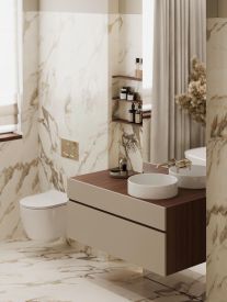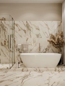 Вентилируемый фасад, облицованный керамогранитом под мрамор и дерево, в сочетании с клинкерным кирпичом, гарантирует долговечность и безупречный внешний вид на долгие годы.