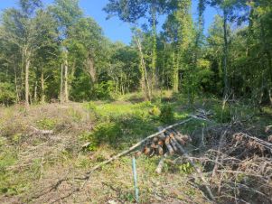 Ровный участок, почти без уклона. Тупиковая дорога (люди живут круглогодично). Участок у дороги, со всех сторон деревья, на самом участке плодовые деревья. С одной стороны дорога, за ней ручей летний, со второй лес, с третей - летний ручей, а за ним пока пустующий участок с лесом, с четвёртой стороны-лес на пустом участке. Так что пока окружены лесом со всех сторон.