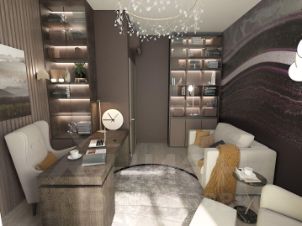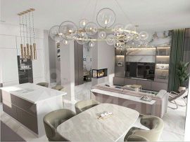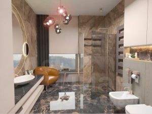 Выполнена предчистовая отделка, все стены оштукатурены , разведены коммуникации, установлены инсталяции в санузлах, закуплены межкомнатные двери. Все по дизайн проекту.
