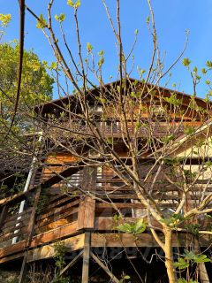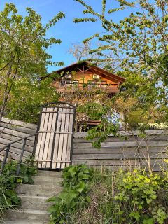 Участок на горе (есть три площадки выровненных), сад с декоративными и фруктовыми деревьями.