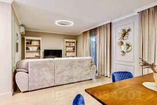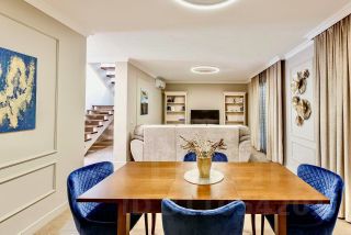 Площадь дома составляет 155 м², он выполнен в дизайнерском стиле и имеет функциональную планировку. В доме кухня-гостиная с выходом на террасу, три спальни (одна из которых мастер), гардеробная, два санузла, кабинет/гостевая комната, техническое помещение и прачечная.