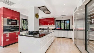Высокие потолки и просторные помещения наполняют виллу светом и воздухом, а изысканная прихожая плавно переходит в просторную гостиную. Из гостиной открывается выход на террасу, где расположены летняя кухня, пышный сад с большим бассейном и джакузи,