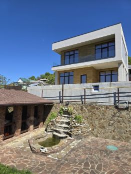 Вилла в живописном месте. В комплексе из трех домов. Закрытая территория. Рядом нац. парк.Солнечная сторона. Идеальная роза ветров.Высота 235 н. у. м. Расположена между двух ущелий с видом на море и горы, в т. ч. г. Ахун и г. .Сахарная головка. Дом сдан, адрес получен. Парк, озеро, конный клуб, базы отдыха, река-все это есть в селе. Рядом дорогие коттеджные посёлки. Дом под чистовую отделку (гибсовая штукатурка, отопление, электрика, вода,канализация, кондиционирование, вентиляция, ТВ, интернет, все разведено).Наружная отделка виллы гибкая керамика "DIVU" +гибкая доска. В доме:
