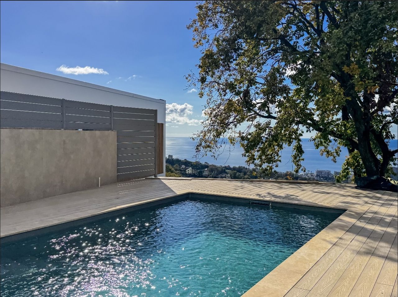 Каждая вилла — это воплощение роскоши и комфорта. Премиальная отделка фасада из крупноформатного керамогранита, алюкобонда и ДПК-рейки, а также панорамное алюминиевое остекление, наполняющее дома естественным светом, создают неповторимую атмосферу. Из окон открывается захватывающий дух панорамный вид на море и город. Высокие потолки и продуманная планировка подчеркивают простор и элегантность интерьеров.
