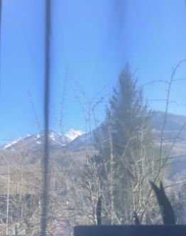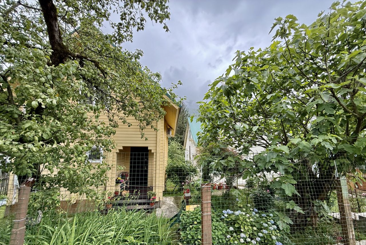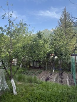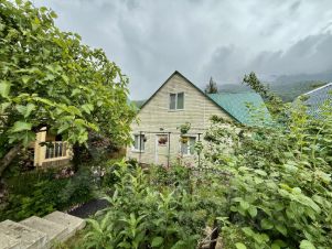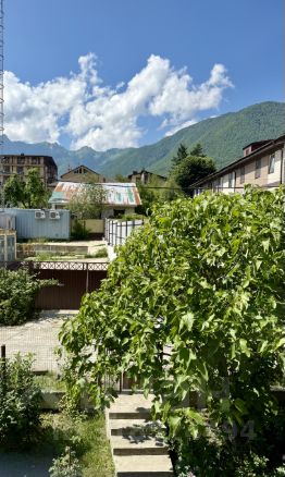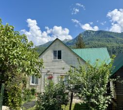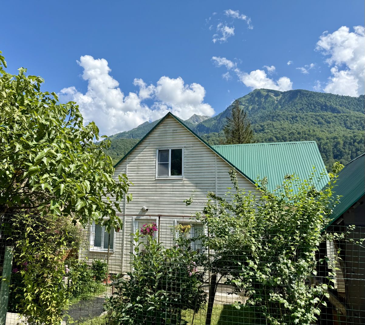 Участок правильной прямоугольной формы, ровный. На нем расположены два дома, каждый площадью 100-150кв. Из окон домов открываются прекрасные виды на гору Аибга.