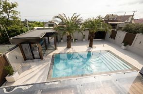 Планировка продумана для комфортной жизни большой семьи: просторные спальни, светлая гостиная с панорамным остеклением, современная кухня, терраса с видом на сад и бассейн.