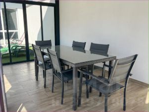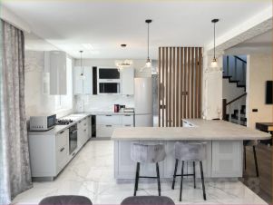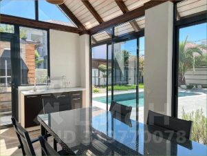 Кухня-гостиная с большими панорамными окнами, создающими ощущение простора и наполненности пространства солнечным светом. Гости смогут наслаждаться прекрасным видом на бассейн прямо из гостиной зоны. Идеальное место для семейных ужинов и приема гостей.
