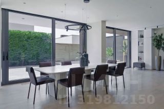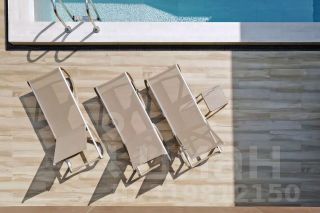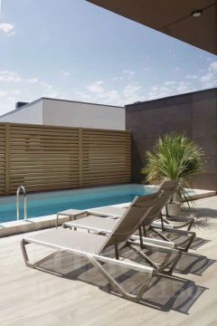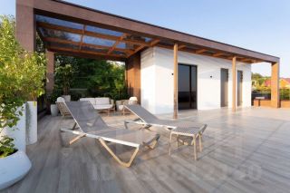 Во всех комнатах установлены панорамные окна, а на балконах — стеклянные ограждения, поэтому дом максимально наполнен светом и воздухом. В кухне-гостиной применили витражи-слайдеры, которые в летний период можно открыть, позволяя морскому воздуху проникать внутрь. Организовать единое пространство с природой удалось с помощью использования в интерьере и экстерьере керамогранита, напоминающего древесную и каменную текстуры.