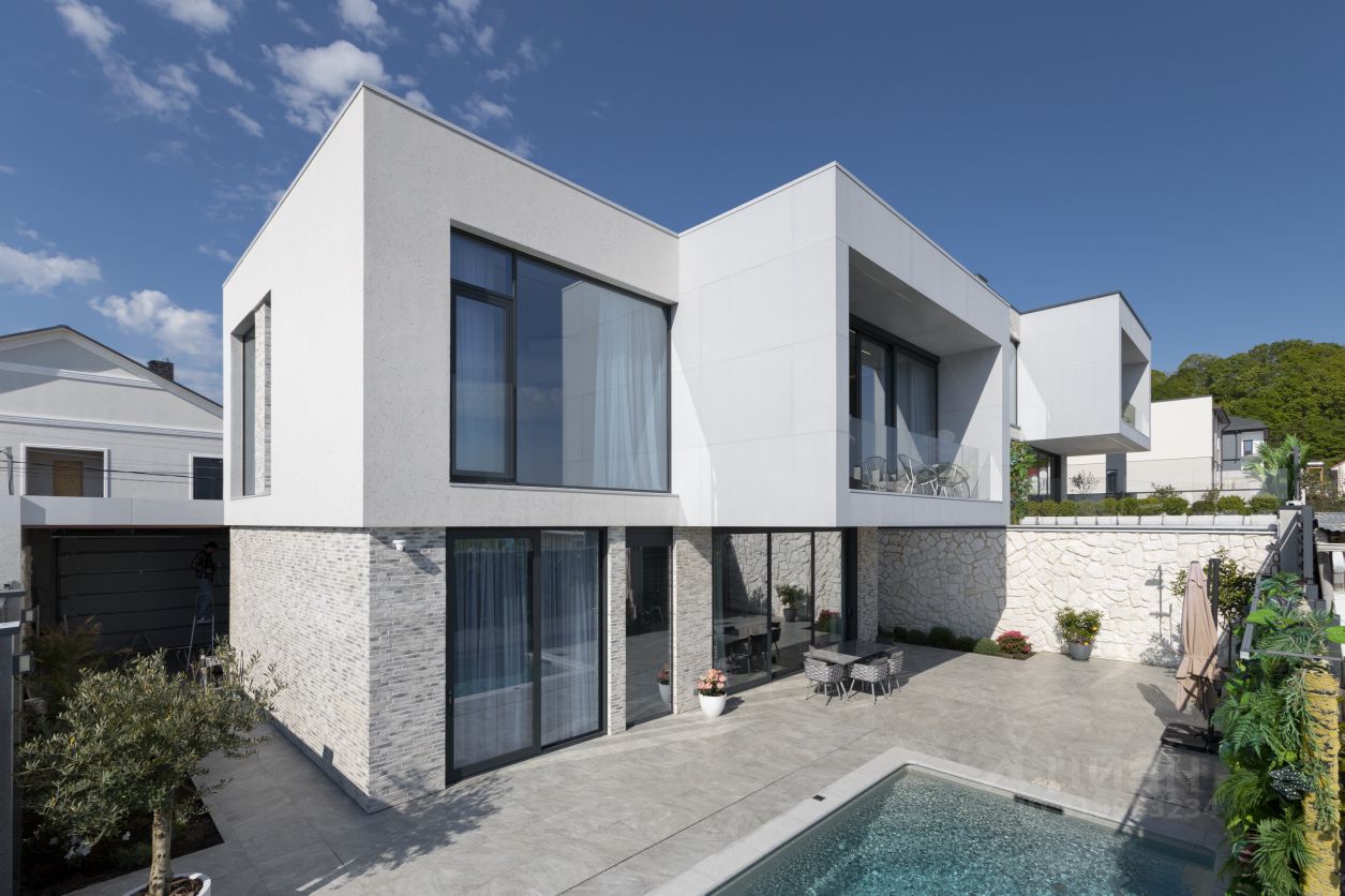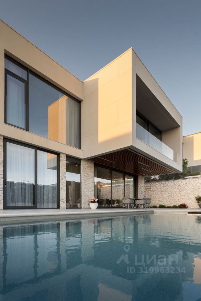 Качество и стиль: Премиальная отделка, панорамное остекление, современный бассейн, возможность интеграции системы умный дом.