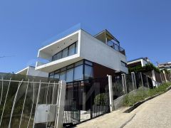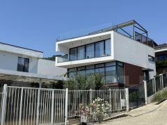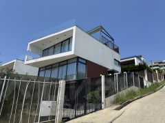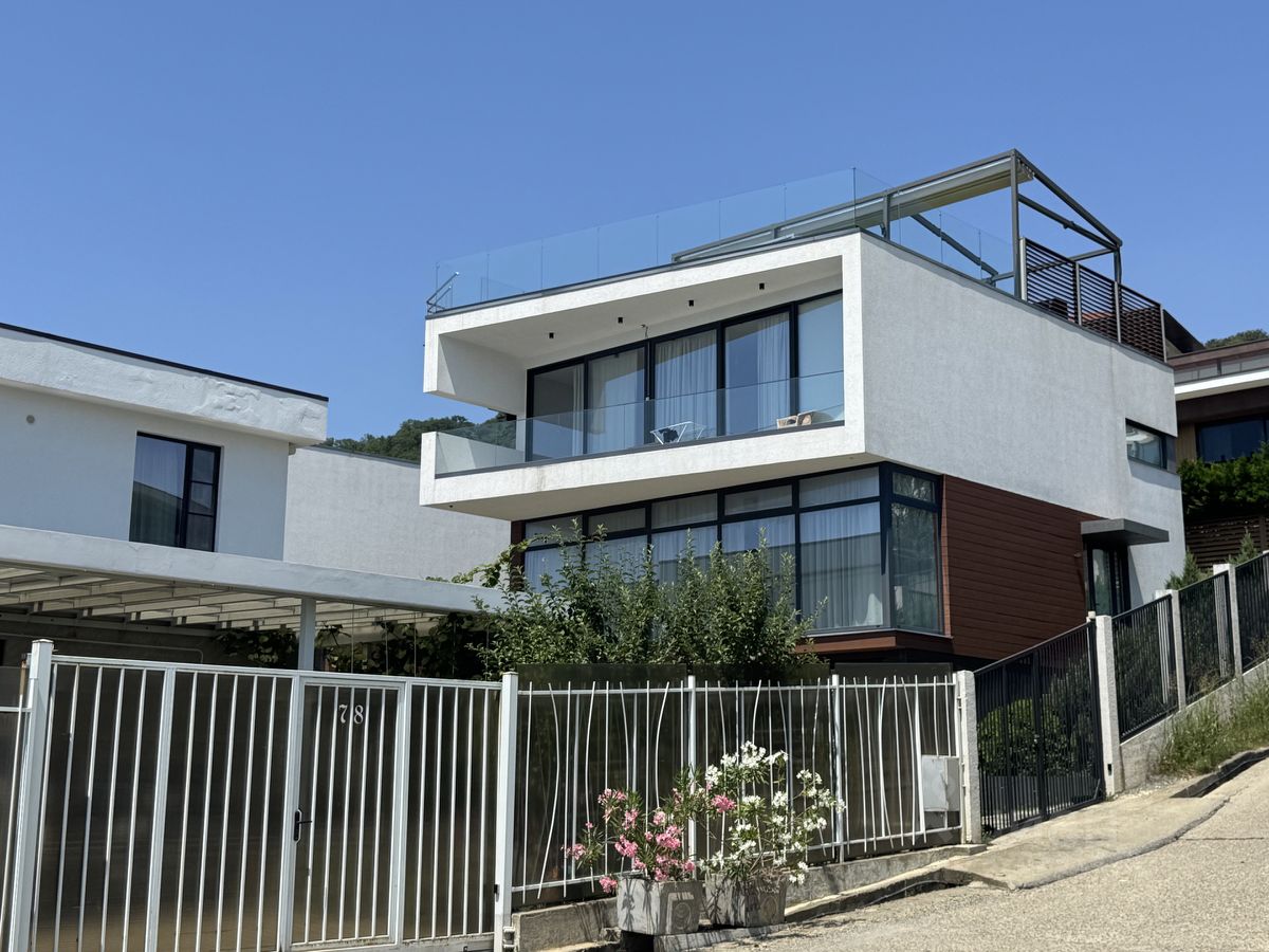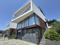 Современная архитектура дома с изящным наполнением и грамотной планировкой. Великолепное архитектурное решение исполнено в самых лучших традициях хай-тека, который характеризуется строгой геометрией фасадных линий, большой площадью витражного остекления. Прекрасным дополнением к архитектуре служит красивый ландшафтный дизайн прилегающей к дому территории. Участок украшен пальмами, рододендронами, олеандрами.