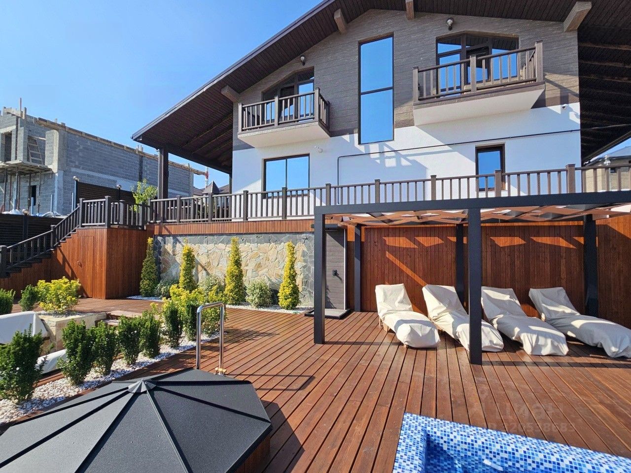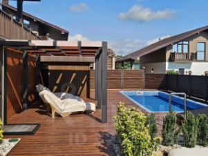 На участке площадью 6 соток выполнен ландшафтный дизайн и создана приватная зона отдыха с большим бассейном, площадкой для загара, оборудованной зоной барбекю, декоративными деревьями, цветущими кустарниками и каменными дорожками, создающими атмосферу загородного уюта на южном побережье.