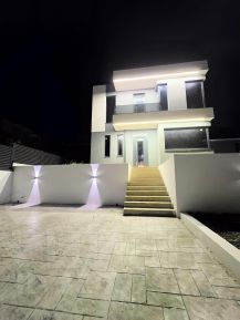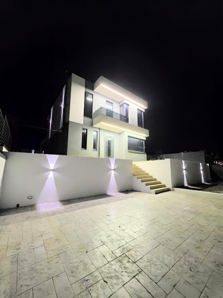 Наружная отделка дома выполнена в стиле мокрый фасад. Использовал фасадный клей Церезит и камешковую силиконовую штукатурку Церезит (в простонародье Шуба). Это придаёт дому эстетичный и современный вид. Выполнена дизайнерская подсветка дома и участка. Дом строил для себя, на материалах не экономил, использовал, только качественные материалы. Для понимания подбетонка (основание под фундамент) 15 см высотой и фундаментная плита 45 см, Есть фото и видео отчет о строительстве.