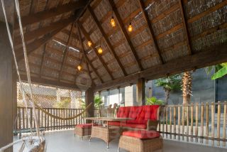 Зона в балийском стиле с уютными качелями, гамаками и деревянными террасами.