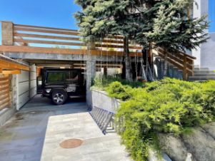 На прилегающей территории расположены личный бассейн, площадка для приготовления барбекю и парная. Также предусмотрен отапливаемый гараж на две машины с автоматическим управлением воротами. Озеленение территории гармонично сочетается с архитектурным стилем и акцентирует его привлекательный внешний облик.