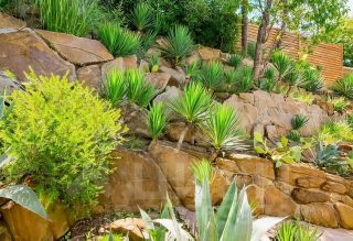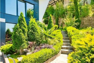 Сад будущего сделан ландшафтный дизайн, высажены карликовые кипарисы, смонтированы светящиеся камни, организованы дорожки с сенсорной подсветкой