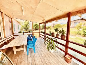 просторную кухню-гостиную(25м2) с выходом на крытую веранду(18м2)