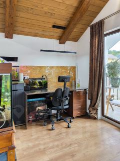 Полы на 2м этаже - ванная и лестница -керамогранит; кабинет, спальня и студия -дорогой ламинат.