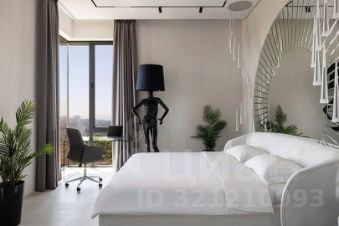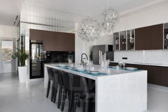 Кухонный гарнитур выполнен из шпона венге с кварцевой столешницей и футуристичной встроенной техникой Miele. Оснащение кухни включает также полубарные стулья из натуральной кожи и дизайнерские светильники.