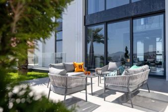 Вилла предлагается полностью готовой к заселению с дизайнерским ремонтом, премиальной мебелью и современной бытовой техникой. Обратите внимание на мебель, включая модульный диван Ferretti с отделкой из натурального шпона, кресла и пуфы OrthoSleep, а также стильные элементы декора.