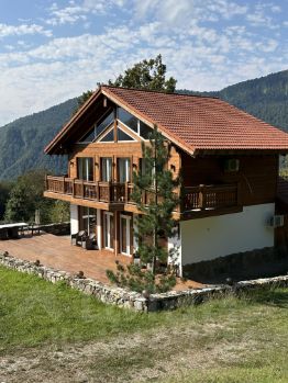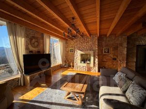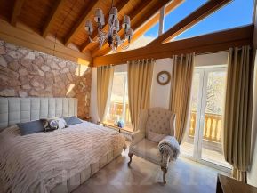 В доме — уютная гостиная, просторная кухня-столовая, спальни с видами на горы, сауна для восстановления после прогулок и спортивных активностей. Интерьер выдержан в современном стиле с элементами альпийского шале — уют, тепло, текстуры дерева и камня, натуральное освещение. Участок граничит с лесным массивом. Вокруг — ни одного соседа, только лес и горы.