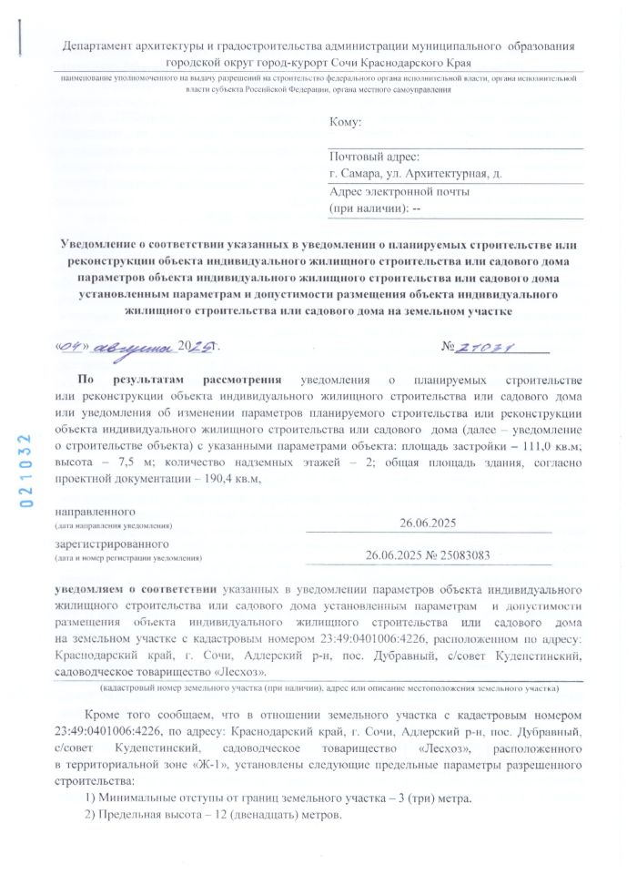 Получено Уведомление о соответствии планируемого строительства, 190 кв.м, 2 эт.