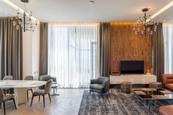 Просторная кухня-гостиная, объединённая удобной планировкой.