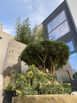 Выполнено хорошо продуманное озеленение участка. Есть свои мини-джунгли, высажена пиния крупномер 7 метров высотой, японский садик в бетонном вазоне 3.3 на 3 метра с краснокнижной красной сосной ниваки. Этот же вазон играет роль крыши для размещения бани.